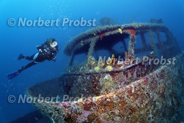 Taucher, Brücke, Aufbauten, Schiffswrack, "Round Table", Speyside, Trinidad & Tobago, Kleine Antillen, Karibisches Meer | Diver, bridge, superstructure, ship, wreck, "Round Table", Speyside, Tobago, Trinidad
