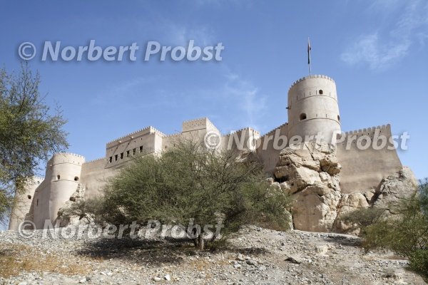 Fort Nakhal, oder Nakhl, Festung, oder Husn Al Heem, Büsche, historischer Lehmbau, Al-Batinah Provinz, Sultanat von Oman, Arabische Halbinsel Asien | Fort Nakhal oder Nakhl, Fortification, or Husn Al Heem, historic clay building, bushes, Al-Batinah province, Sultanate of Oman, arabic peninsula, Asia
