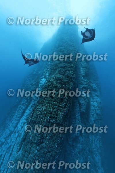 Zwei Riesenrochen, Teufelsrochen, (Manta birostris), umkreisen steil aufragenden Felsen vulkanischen Ursprungs, Rochen, Fisch, Roca Partida, Socorro, Revillagigedo Inseln, Archipel, Mexiko, Ost-Pazifik | Two Giant Manta, (Manta birostris), circeling around erecting rock of volcanic origin, ray, fish, Roca Partida, Revillagigedo Islands, Archipelago, Mexico, East-Pacific