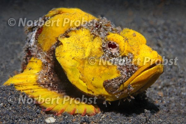 Gelber Skorpionfisch, unbestimmt, auf Sandgrund, Gangga Insel, Bangka Inseln, Nord Sulawesi, Indonesien, Molukkensee, Pazifik Asien | Yellow skorpionfish, unidentified, on sand bottom, Gangga island, Bangka islands, North Sulawesi, Indonesia, Molukka Sea, Pacific, Asia