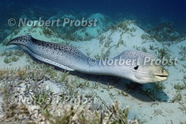 Riesenmuräne, (Gynothorax javanicus), schwimmt über Seegraswiese, Makadi Bay, Hurghada, Ägypten, Rotes Meer, Afrika | Giant Mory, (Gymnothorax javanicus) swimms above sea weed, Makadi Bay, Hurghada, Egypt, Red Sea, Africa