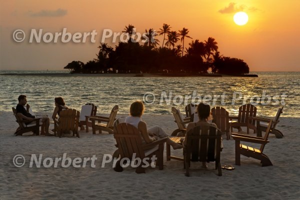 Personen sitzen auf Stühlen am Strand mit Longdrink vor untergehender Sonne, Malediveninsel, Meer, golden, Rihiveli, Insel, Malediven, Süd Male Atoll, Archipel, Indischer Ozean, Asien | People are sitting on chairs at beach with longdrink in front of golden sundown, Maldive Island, Rihilveli, Island, Maldives, South Male Atoll, Archipelago, Indian Ocean, Asia