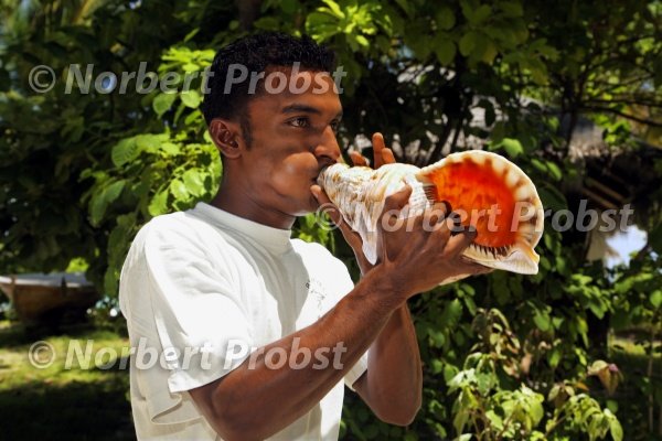 Malediver bläßt auf Tritonshorn zum Essen, Malediveninsel, Rihiveli, Südmale Atoll, Malediven, Archipel, Asien, Indischer Ozean | Maldivian blows tritons horn, shell, for dinner, maldive island, South Male Atoll, Maldives, Achipelago, Asie, Indian Ocean |