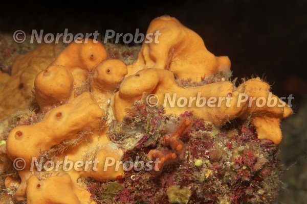 Oranger Hornschwamm (Agelas oroides), Insel Korfu, Griechenland, Mittelmeer | Oranges Agelas Sponge (Agelas oroides), Axubella Schwamm, (Axinella damicornis), Corfu island, Greece, Mediterranean Sea