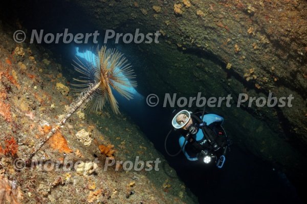 Taucher in Höhle mit Lampe betrachtet Schraubensabelle (Sabella spallanzani), Insel Korfu, Ionische Inseln, Griechenland Mittelmeer | Diver in cave looks at Mediterranean Fanworm (Sabella spallanzani), Corfu island, Ionian Islands, Greece, Mediterranean Sea