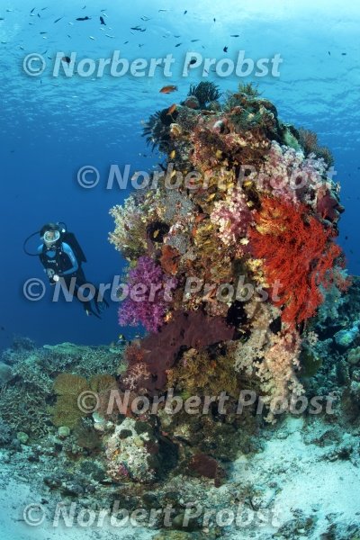 Taucher betrachtet Korallenblock mit vielen verschiedenen Korallen, Fischen und Niederen Tieren, Wakatobi Island, Tukangbesi Archipel, Wakatobi National Park, UNESCO Weltnaturerbe, Banda See, Südost-Sulawesi, Indonesien | Diver looks at Coral block with many different coral, fishes and invertebrates, Wakatobi island, Tukangbesi Archipelogo, Wakatobi Marine Park, UNESCO, World Heritage Site, Banda Sea, Southeast-Sulawesi, Indonesia