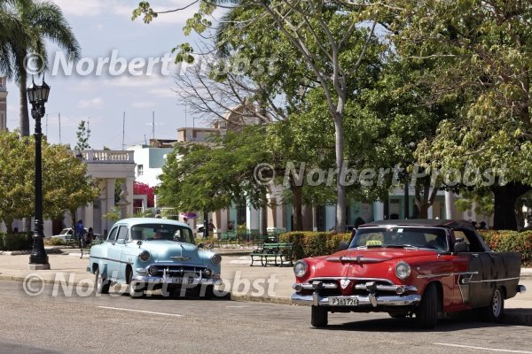 | Oldtimer am Parque Jose Marti, l. Chevrolet Two-Ten, 1953 blaugrün, r. Dodge Kingsway Custom 1955 rot, Altstadt Cienfuegos, Hauptstadt Provinz Cienfuegos, Kuba, Karibik | Oldtimer at Parque Jose Marti, l. Chevrolet Two-Ten, 1953 blue green, r. Dodge Kingsway Custom 1955 red, old district, Capital Cienfuegos, District Camagüey, Kuba, Karibik |