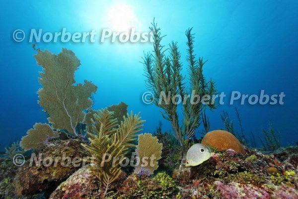 Riffrücken im Korallenriff. Korallengarten mit verschiedenen Krallen. Vieraugen Falterfisch (Chaetodon capistratus). Halimeda Algen (Halimeda sp.) Sonnenschein von Wasseroberfläche. Barriereriff, San Pedro, Insel, Ambergris Cay, Belize, Mittelamerika, Zentralamerika, Karibik
