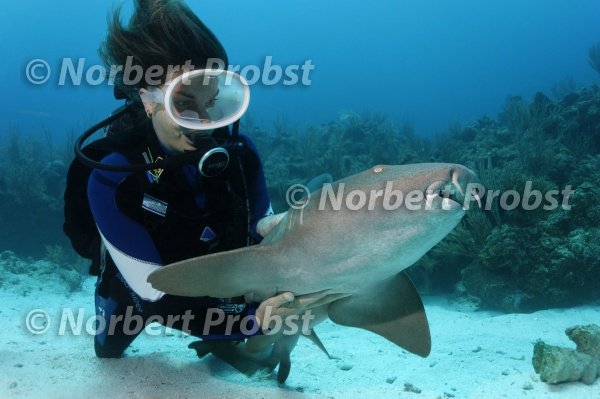 Fasziniert streichelt Taucherin Karibik-Ammenhai (Ginglymostoma cirratum) auf Unterseite. Spezielle Berührung lässt Hai in Apathie fallen. Gefährliches Spiel. Barriereriff, San Pedro, Insel, Ambergris Cay, Belize, Mittelamerika, Zentralamerika, Karibik