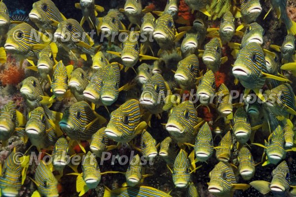 Schwarm Goldband-Süßlippen (Plectorhinchus polytaenia), von vorne, Raja Ampat Archipel, Papua Barat, West-Neuguinea, Pazifik, Indonesien | Ribboned Sweetlips (Plectorhinchus polytaenia) head on, Raja Ampat archipelago, Papua Barat, West-New Guinea, Pacific, Indonesia