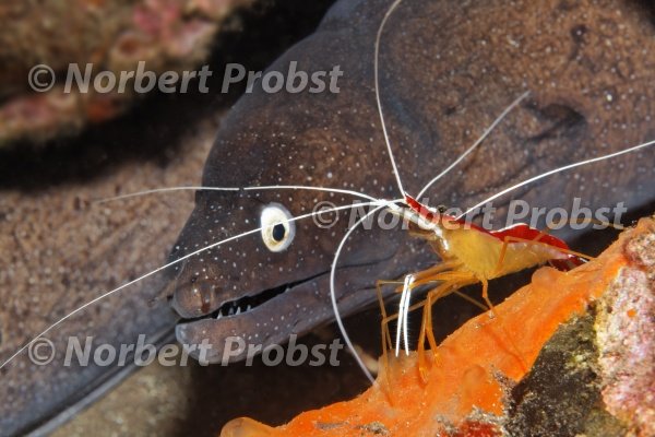 Schwarze Muräne, auch Fürst August Muräne, (Muraena augusti) mit Grabhams Putzergarnle (Lysmata Grabhami), im Unterschlupf, Insel, Madeira, Portugal, Europa, Atlantik | Dotted moray, (Muraena augusti) with Scarelt-striped shrimp, Cleaning Shrimp, (Lysmata grabhami), in its hideaway, Madeira, Island, Portugal, Europe, Atlantic, Ocean