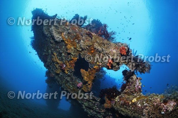 Heck, Schiffswrack, amerikanisch, aufragend, dicht mit Korallen bewachsen, Stückgutfrachter, Liberty, Kriegsschiff, Zweiter Weltkrieg, Tulamben Bali, Indonesien, Indischer Ozean, Bali Meer.| Erecting stern of american shipwreck overcrusting with corals, bulk carrier, World War II, Tulamben, Bali, Indonesia, Indian Ocean, Bali Sea