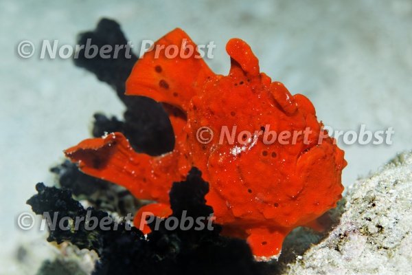 Rundflecken Anglerfisch, Gemalter Anglerfisch, (Antennarius pictus), rot, sitzt in Schwamm, Saparua, Insel, Molukken, Indonesien, Pazifik, Banda See | Painted frogfish, (Antennarius pictus), red, sits in Sponge, Saparua, island, Maluku, islands, Indonesia, Pacific, Banda Sea