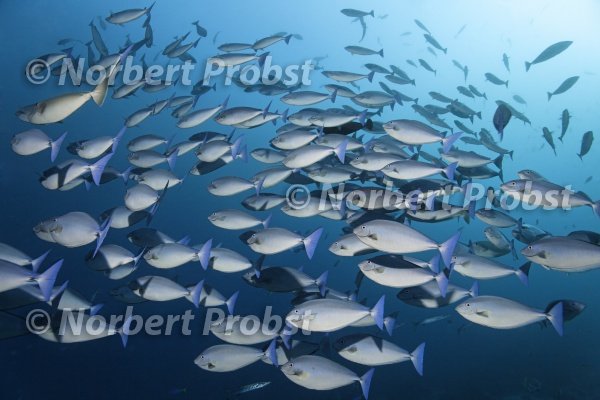 Schwarm Blauschwanz Doktorfisch oder Blauschwanz Einhornfisch (Naso caeruleacauda), schwimmt im offenen Meer, Raja Ampat Archipel, Papua Barat, West-Neuguinea, Pazifik, Indonesien | School Bluetail unicornfish (Naso caeruleacauda), swims at the blue, Raja Ampat archipelago, Papua Barat, West-New Guinea, Pacific, Indonesia