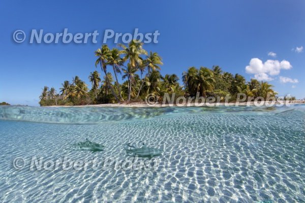 Oben Insel mit Palmen, unten zwei, Schwarzspitzen-Riffhai (Carcharhinus melanopterus) schwimmt über Sandgrund, Pazifik Französisch Polynesien, Frankreich, Pazifik | Above, island with palmes, underneath, two, Blacktip reef shark (Carcharhinus melanopterus) swims above sand ground, Pacific, Windward islands, French Polynesia, France