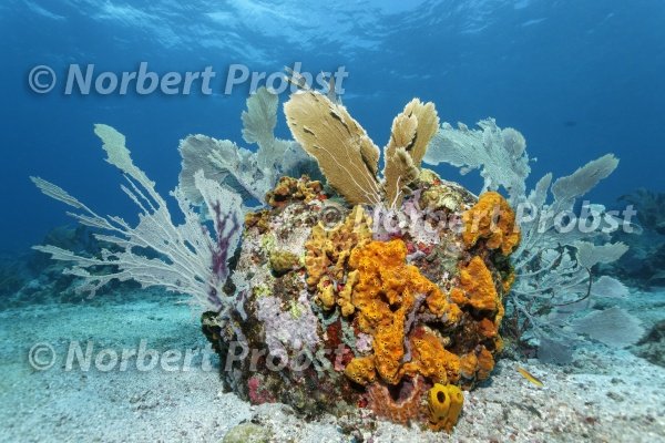 Formation, Block, verschiedene, vielfarbige, Schwämme, Korallen im Sandgrund, Little Tobago, Speyside, Trinidad & Tobago, Kleine Antillen, Karibisches Meer | Formation, block, coral, different, colorful, sponge, sand, bottom, Little Tobago, Trinidad