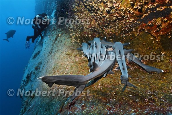 Taucher beobachtet Weißspitzenriffhaie, (Triaenodon obesus), schlafen auf Felsen, an Steilwand, Roca Partida, Socorro, Revillagigedo Inseln, Archipel, Mexiko, Ost-Pazifik | Diver looks at Whitetip Reef Shark, (Triaenodon obesus), sleeping on rock, wall, Roca Partida, Socorro, Revillagigedo Islands, Archipelago, Mexico, East-Pacific