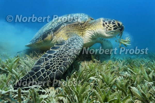 Grüne Schildkröte (Chelonia mydas) frisst Seegras auf Seegraswiese. Hurghada, Ägypten, Afrika, Rotes Meer | Green Sea Turtle (Chelonia mydas) feeds on sea weed meadow, gras, Hurghada, Egypt, Africa, Red Sea