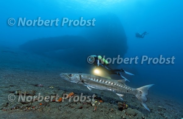 Großer Barrakuda mit Taucher vor Wrack Liberty, Fisch, Tulamben, Bali, Indonesien, Indischer Ozean, Bali Meer. | Great barracuda with diver in front of lLiberty wreck. Tulamben, fish, Bali, Indonesia, Indian Ocean, Bali Sea.