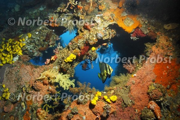 Spitzmaulfledermausfisch (Platax pinnatus), Durchbruch im Liberty Wrack. Fledermausfisch, Fisch, Tulamben, Bali, Indonesien, Indischer Ozean, Bali Meer.| Dusky batfish (Platax pinnatus), breakthrough inside Liberty wreck, Tulamben, Bali, Indonesia, Indian Ocean, Bali Sea.