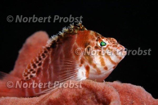 Gefleckter Büschelbarsch (Cirrhitichtys oxycephalus) sitzt auf Schwamm, Fisch, Barsch, Portrait, Bali, Insel, Kleine Sundainseln, Bali See, Indonesien, Indischer Ozean, Asien | Spotted Hawkfish (Cirrhitichtys oxycephalus) sits on Sponge, fish, portrait, Bali, island, Lesser Sunda Islands, Bali Sea, Indonesia, Indian Ocean, Asia