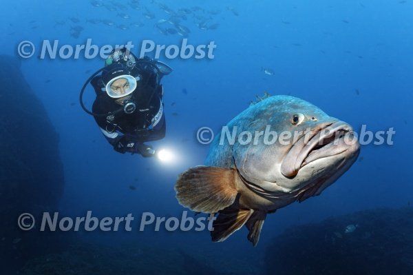 Taucher beobachtet Brauner Zackenbarsch, (Epinephelus marginatus) im Blauwasser, Insel, Madeira, Portugal, Europa, Atlantik | Diver watches Dusky Grouper, (Epinephelus marginatus) in open water, Madeira, Island, Portugal, Europe, Atlantic, Ocean
