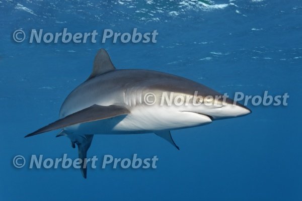Seidenhai, (Carcharhinus falciformis) schwimmt im Blau, Republik Kuba, Karibik, Karibisches Meer, Mittelamerika | Silky Shark, (Carcharhinus falciformis), swims in open water, Republic of Cuba, Caribbean Sea, Middle America