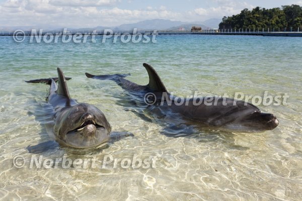 Großer Tümmler (Tursiops truncatus), zwei, Strand, Säugetier, Delfin, Flachwasser, über Wasser, Ocean Adventure, Subic Bay, Insel, Luzon, Philippinen, Südchinesisches Meer, Pazifik | Bottlenose Dophin (Tursiops truncatus), Ocean Adventure, mammals, dolphin, Beach, shallow water, above, water, Subic Bay, Luzon, Island, Philippines, South China Sea, Pacific