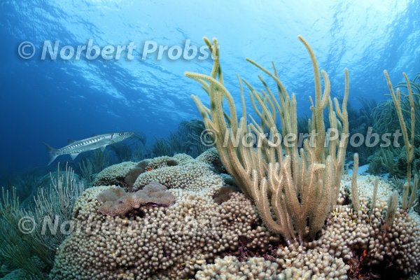 Unterwasserlandschaft, Riffdach mit Großer Barrakuda (Spyraena barracuda), Große Schlitzporen-Strauchgorgonie (Plexaurella nutans) und zahlreichen, verschiedenen Korallen, LCA, Saint Lucia, St. Lucia, Insel, Inseln unter dem Wind, Kleine Antillen, Karibik, Karibisches Meer | Underwater scenery with Great barracuda (Spyraena barracuda), Giant slit-pore sea rod (Plexaurella nutans) and many, different corals, LCA, Saint Lucia, St. Lucia, island, Windward Islands, Lesser Antilles, Caribbean, Caribb