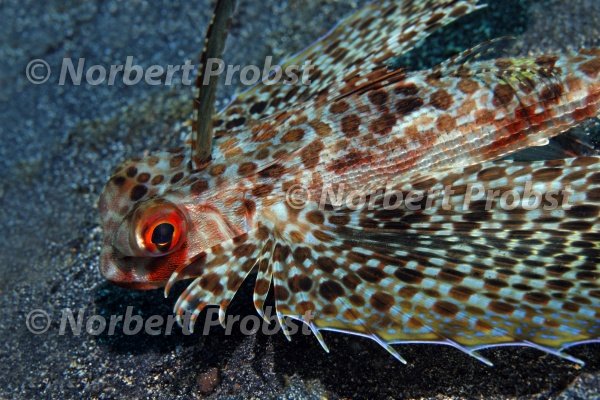 Helmknurrhahn (Dactyloptena orientalis) streift mit gefächerten Brustflossen über Sandgrund, Gangga Insel, Bangka Inseln, Nord Sulawesi, Indonesien, Molukkensee, Pazifischer Ozean, Asien | Flying gurnard (Dactyloptena orientalis) swims above sandy bottom with spread out pectoral fins, Gangga Island, Bangka Islands, North Sulawesi, Indonesia, Molukka Sea, Pacific Ocean, Asia