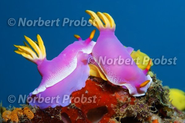 Pinkfarbene Prachtsternschnecken (Hypseltodoris bullocki) neben Gelege zeigen Paarungsbereitsschaft, Gangga Insel, Bangka Inseln, Nord Sulawesi, Indonesien, Molukkensee, Pazifischer Ozean, Asien | Pink Hypseltodoris (Hypseltodoris bullocki) beside nest of eggs shows receptiveness, Gangga Island, Bangka Islands, North Sulawesi, Indonesia, Molukka Sea, Pacific Ocean, Asia