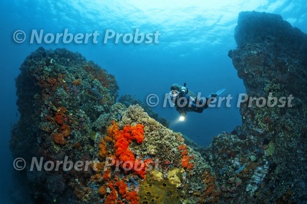 Taucherin treibt in Strömung durch dicht mit Korallen bewachsenen Riffeinschnitt, Gangga Insel, Bangka Inseln, Nord Sulawesi, Indonesien, Molukkensee, Pazifischer Ozean, Asien | Diver foats in current through reef breakthrough, tightly covered with different corals, Gangga Island, Bangka Islands, North Sulawesi, Indonesia, Molukka Sea, Pacific Ocean, Asia
