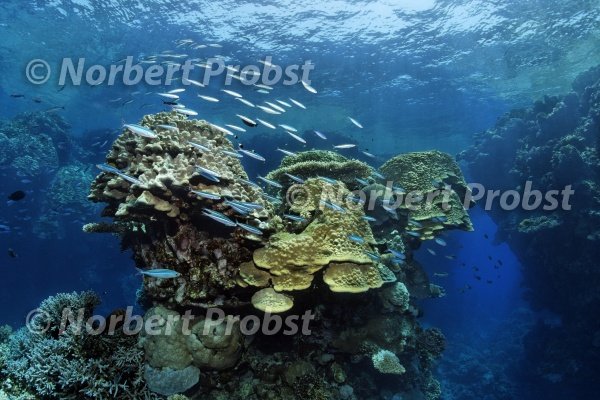 Schwarm Dreistreifen-Füsiliere (Pterocaesio trilineata) schwimmen um Korallenturm, Korallenriff, Sharp Malahi, Ägypten, Rotes Meer, Afrika | Shoal Three-Stripe-fusilier (Pterocaesio trilineata) swimmes arround coral tower, reef, Sharp Malahi, Egypt, Red Sea, Africa