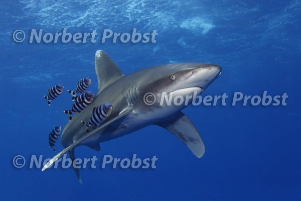 Weißspitzen-Hochseehai, (Carcharhinus longimanus) mit Pilotfischen, (Naucrates ductor), schwimmt im blauen Wasser, Sharm el Sheik, Ägypten, Rotes Meer, Afrika | Oceanic Whitetip shark, (Carcharhinus langimanus), with Pilofishes, (Naucrates ductor), swims in blue water, Sharm el Sheik, Egypt, Red Sea, Africa