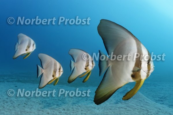 Vier Langflossen-Fledermausfische (Platax teira) Schwarm, schwimmen über Sandgrund, Makadi Bay, Hurghada, Ägypten, Rotes Meer | Four Longfin-Batfish (Platax teira), school, swim over sand ground, Makadi Bay, Hurghada, Egypt, Red Sea