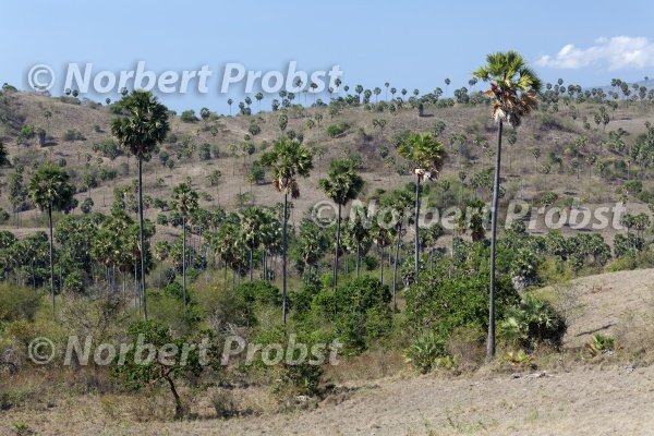 Landschaft mit Palmyrapalme (Borassus flabellifer) und Buschwerk, Komodo Nationalpark, Unesco Weltnaturerbe, Insel Komodo, Kleine Sundainseln, Indonesien | Landscape with Asian palmyra palm (Borassus flabellifer), toddy palm, or sugar palm and bushes, Komodo National Park, Unesco World Hertage Site, Komodo Island, Lesser Sunda Islands, Indonesia