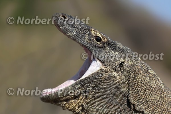 Gähnender Komodowaran (Varanus komodoensis), mit weit geöffnetem Maul, Komodo Nationalpark, Unesco Weltnaturerbe, Insel Komodo, Kleine Sundainseln, Indonesien | Yawning Komodo Dragon (Varanus komodoensis), with wide open Mouth, Komodo National Park, Unesco World Hertage Site, Komodo Island, Lesser Sunda Islands, Indonesia