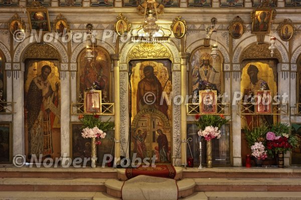 Griechisch orthodoxer Altar in Klosterkirche, Kloster Panagia Theotókos tis Paleokastritsas, auch Panagia Theotokos, Insel Korfu, Ionische Inseln, Griechenland | Greek orthodox altar iside monastry church, Monastery Panagia Theotókos tis Paleokastritsas auch Panagia Theotokos, Corfu island, Ionian Islands, Greece