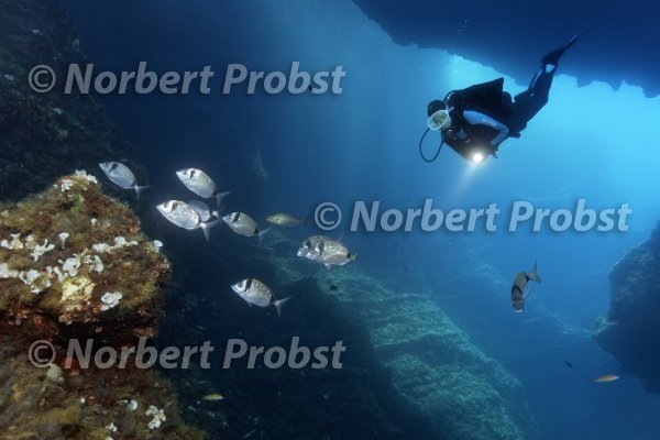 Taucher in Höhle mit Lampe betrachtet Schwrm Zweibindenbrassen (Diplodus vulgaris), Insel Korfu, Ionische Inseln, Griechenland Mittelmeer | Diver in Cave with torch looks at school of Common Two-Banded Sea Bream (Diplodus vulgaris), Corfu island, Ionian Islands, Greece, Mediterranean Sea