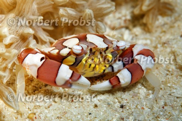 Harlekinkrabbe (Lissocarcinus laevis) unter Anemone im Sand, Großes Barriereriff, UNESCO, Weltnaturerbe, Queensland, Cairns, Pazifischer Ozean, Australien | Harlequin swim crab (Lissocarcinus laevis) under anemone on sand, Great Barrier Reef, UNESCO, World Heritage Site, Queensland, Cairns,Pacific, Ocean, Australia