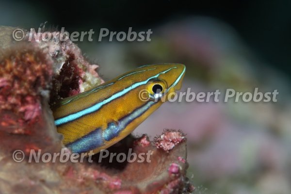 Blaustreifen Blenny (Plagiotremus rhinorhynchos), Wakatobi Island, Tukangbesi Archipel, Wakatobi National Park, UNESCO Weltnaturerbe, Banda See, Südost-Sulawesi, Indonesien | Bluestriped fangblenny (Plagiotremus rhinorhynchos), Wakatobi Marine Park, UNESCO, World Heritage Site, Banda Sea, Southeast-Sulawesi, Indonesia