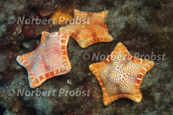 Drei Placenta Kissenseestern (Sphaerodiscus placenta), Halbinsel Sithonia, Chalkidiki, auch Halkidiki, Ägäis, Mittelmeer, Griechenland | Three Placenta Star fish (Paerodiscus placenta), Peninsula Sithonia, Chalkidiki or Halkidiki, Aegean, Mediterranean Sea, Greece