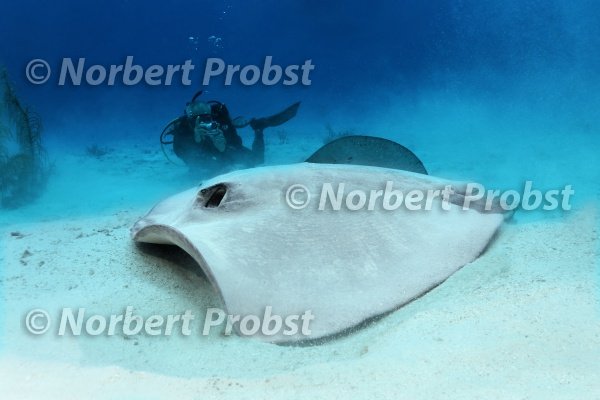 Taucher fotografiert kapitalen Rauschwanz-Steckrochen (Dasyatis centroura) auf Sandgrund, Hopkins, Dangria, Belize, Mittelamerika, Zentralamerika, Karibik