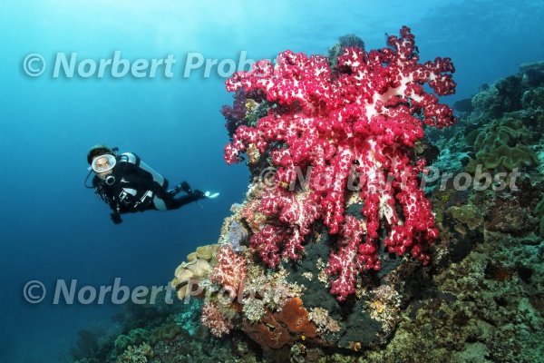 Taucher betrachtet sehr große, rote Weichkoralle (Dendronephthya sp.), Raja Ampat Archipel, Papua Barat, West-Neuguinea, Pazifik, Indonesien | Diver looka at very large, red soft coral, (Dendronephthya sp.), Raja Ampat archipelago, Papua Barat, West-New Guinea, Pacific, Indonesia