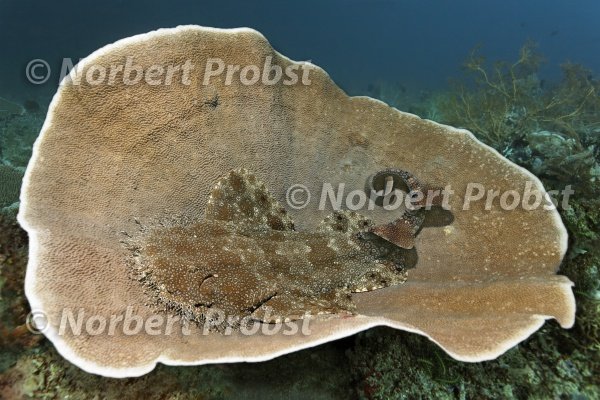 Fransenteppichhai oder Quasten-Teppichhai (Eucrossorhinus dasypogon) liegt auf Plattform Koralle (Coscinarea macneilli), Raja Ampat Archipel, Papua Barat, West-Neuguinea, Pazifik, Indonesien | Tasseled Wobbegong (Eucrossorhinus dasypogon) lies on Platform coral (Coscinarea macneilli), Raja Ampat archipelago, Papua Barat, West-New Guinea, Pacific, Indonesia