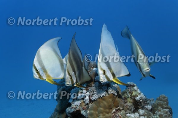 Schwarm Langflossen Fledermausfische (Platax teira), vier, Großes Barriere Riff, UNESCO Weltnaturerbe, Australien Pazifik | Scholl Longfin Batfish, Teira batfish, Roundface Batfish, four, Great Barrier Reef, World Nature Preserve, Australia, Pacific
