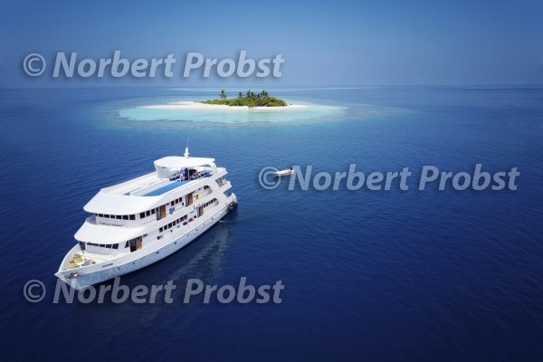 Tauch-Safarischiff MS Keana vor unbewohnter Insel, Luftbild, Ari-Atoll, Indischer Ozean, Republik Malediven | Diving ship MS Keana in front of uninhabited island, aerial view, Ari-Atoll, Idian Ocean, Republic of Maldives