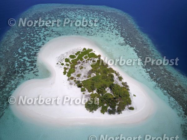 Herzförmige, unbewohnte Insel mit Palmen, Buschwerk, rundum laufenden Sandstrand, vorgelagertes Korallenriff, Luftbild, Ari-Atoll, Indischer Ozean, Republik Malediven | Heart-shaped uninhabited island with palm trees, bushes, all around beach, upstream coral reef, aerial view, Ari-Atoll, Indian Ocean, Republic of Maldives