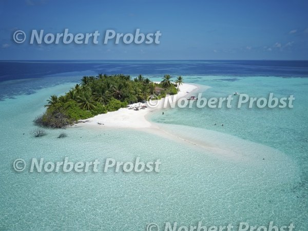 Unbewohnte Insel für Tagesausflüge mit Palmen, Buschwerk, rundum laufenden Sandstrand, vorgelagertes Korallenriff, Luftbild, Ari-Atoll, Indischer Ozean, Republik Malediven | Uninhabited island for daytrips with palm trees, bushes, all around beach, upstream coral reef, aerial view, Ari-Atoll, Indian Ocean, Republic of Maldives