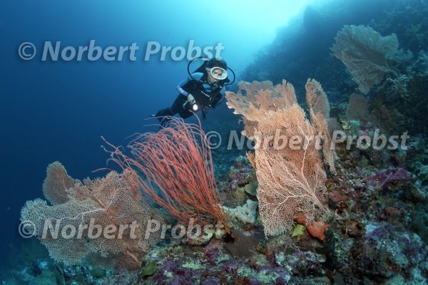 Taucher an Riffabfall betrachten Seefächer, Gorgonien (Anella mollis) und Strauch Rutengorgonie (Ellisella ceratophyta) Wakatobi Island, Tukangbesi Archipel, Wakatobi National Park, UNESCO Weltnaturerbe, Banda See, Südost-Sulawesi, Indonesien | Diver at reef slope looks at Sea fans, gorgonians (Anella mollis) and Red whip coral (Ellisella ceratophyta), Wakatobi island, Tukangbesi Archipelogo, Wakatobi Marine Park, UNESCO, World Heritage Site, Banda Sea, Southeast-Sulawesi, Indonesia
